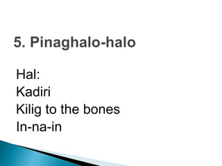 50 examples ng mga salitang kolokyal. Paano - Pano 13. Naroon - Naron 11. Chaka Hindi maganda Not pretty Fes Mukha Face Japorms Porma Clothes Keribels Kuha mo ba.