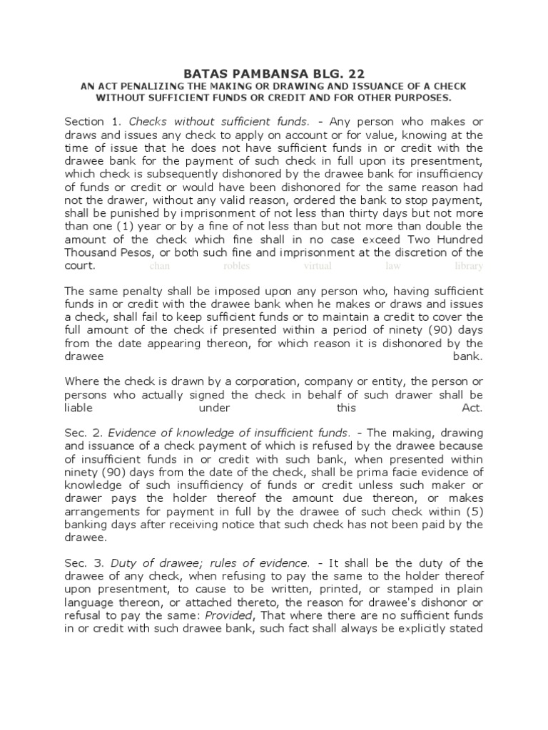22 which penalizes the making or drawing and issuance of a check without funds or credit. Cabizares Download PDF Download Full PDF Package This paper A short summary of this paper 5 Full PDFs related to this paper READ PAPER BATAS PAMBANSA BLG. 22 AN ACT PENALIZING THE MAKING OR DRAWING AND ISSUANCE OF A CHECK WITHOUT SUFFICIENT FUNDS OR CREDIT AND FOR OTHER PURPOSES.